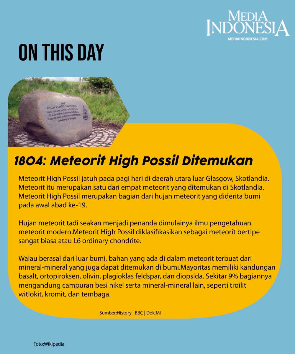 Infografis 15/05/2025 [ON THIS DAY] 1804: Meteorit High Possil Ditemukan Diposkan Oleh:administrator [ON THIS DAY] 1804: Meteorit High Possil Ditemukan Cek Artikel: Tahapan Pendaftaran Vaksinasi Covid-19 untuk Manula