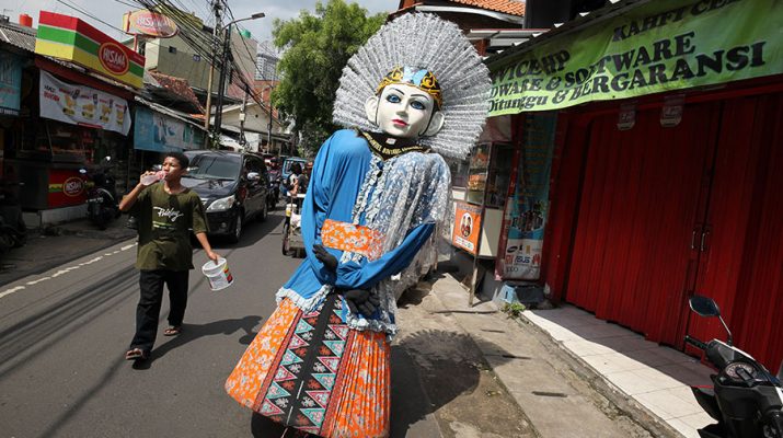 Pengamen Ondel-ondel berkililing di seputaran kawasan Tanah Abang, Jakarta, Selasa (17/06/2025). Pemerintah Provinsi (Pemprov) DKI Jakarta akan menertibkan penggunaan Ondel-ondel Kepada mengamen dengan segera menyusun peraturan daerah (Perda) terkait Pelarangan ondel-ondel yang dipakai Kepada mengamen di jalanan. Ondel-ondel yang merupakan seni budaya Betawi tersebut harus dilestarikan pada tempatnya, bukan dibawa-bawa berkeliling Kepada mengamen. MI/Susanto/gus