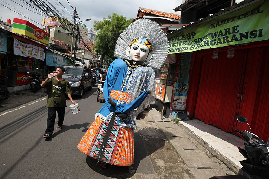 Pengamen Ondel-ondel berkililing di seputaran kawasan Tanah Abang, Jakarta, Selasa (17/06/2025). Pemerintah Provinsi (Pemprov) DKI Jakarta akan menertibkan penggunaan Ondel-ondel Kepada mengamen dengan segera menyusun peraturan daerah (Perda) terkait Pelarangan ondel-ondel yang dipakai Kepada mengamen di jalanan. Ondel-ondel yang merupakan seni budaya Betawi tersebut harus dilestarikan pada tempatnya, bukan dibawa-bawa berkeliling Kepada mengamen. MI/Susanto/gus