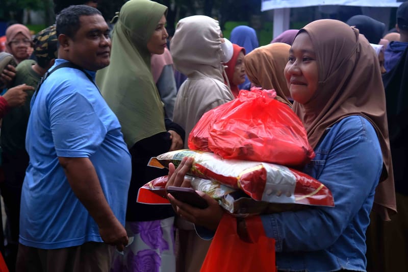 Anggota membawa beras dan minyak goreng yang dibeli pada operasi pasar di Kantor Camat Pontianak Utara di Pontianak, Kalimantan Barat, Jumat (13/12/2024). Pemerintah Kota Pontianak menggelar operasi pasar guna menekan laju inflasi dengan menjual sejumlah bahan pangan berharga murah seperti paket sembako berisi beras premium, minyak goreng dan gula pasir seharga Rp90 ribu, paket telur berisi sepuluh butir seharga Rp10 ribu. ANTARA FOTO/Jessica Wuysang/Per