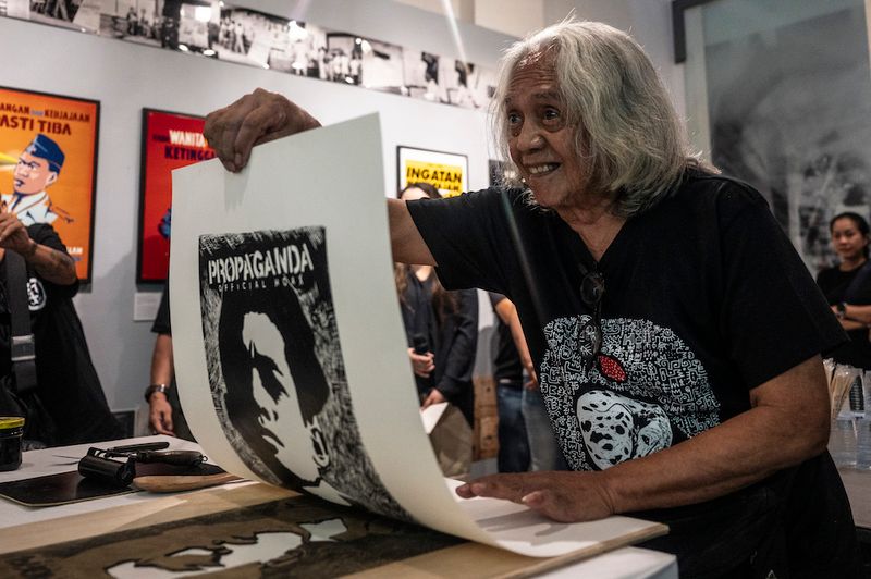 Pameran cukil dan poster bertajuk Propaganda: Official Hoax di Yayasan riset visual mataWaktu, di Jakarta, Kamis (22/8/2024). Pameran yang digelar oleh Yayasan riset visual mataWaktu tersebut dalam rangka menyambut HUT ke-79 Kemerdekaan RI dan berlangsung hingga 7 September 2024.ANTARA FOTO/Aprillio Akbar/sas