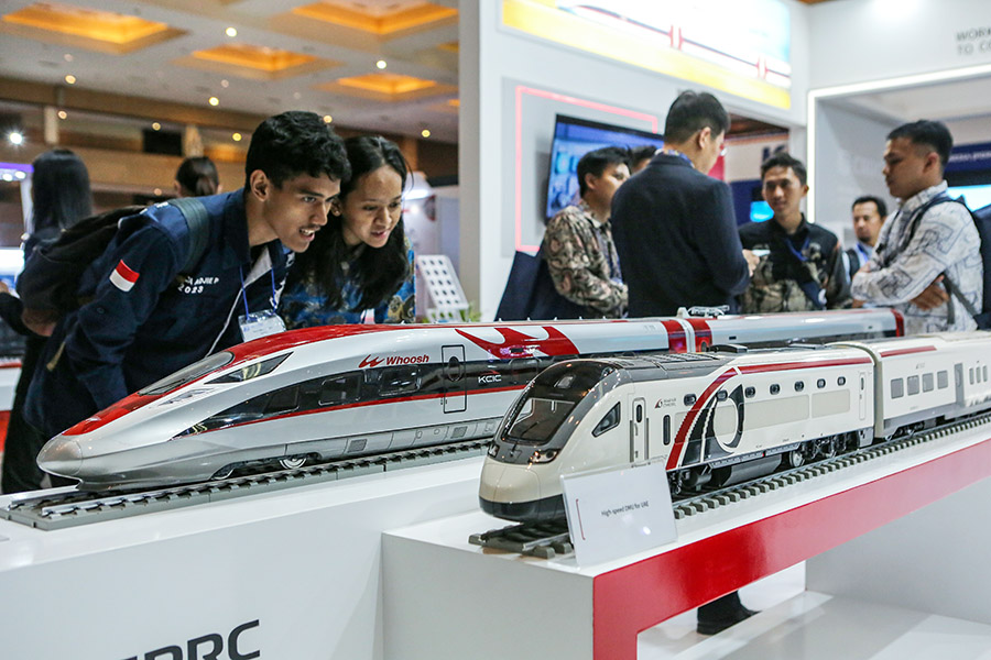 Pengunjung mengamati miniatur kereta Segera yang dipamerkan pada pameran Inamarine dan RailwayTech Indonesia 2025 di JIExpo Kemayoran, Jakarta, Selasa (29/7/2025). Pameran berskala Global yang digelar pada 29-31 Juli 2025 itu diikuti lebih dari 250 perusahaan nasional maupun Global dibidang maritim, offshore, pelabuhan, hingga infrastruktur perkeretaapian dan mobilitas masa depan. ANTARA/Asprilla Dwi Adha/gus