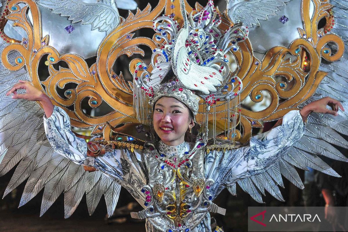 Penari mengenakan Pakaian hias Ketika mementaskan Parade Lenggak Lenggok dalam rangkaian pembukaan Festival Sungai Batanghari di RTH Putri Pinang Matang, Jambi, Jumat (5/7/2024). Festival Batanghari yang masuk dalam Karisma Event Nusantara (KEN) 2024 Kemenparekraf digelar mulai 5-8 Juli 2024 dengan menampilkan atraksi seni budaya khas daerah itu. ANTARA FOTO/Wahdi Septiawan/nym.