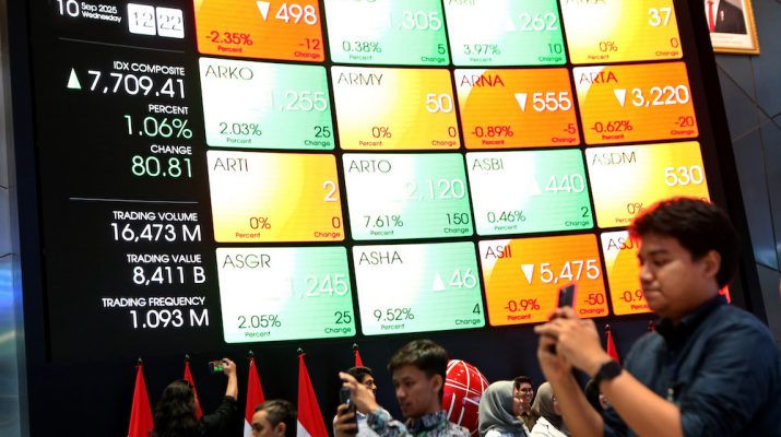 Aktivitas pengunjung di depan layar digital yang menampilkan pergerakan Indeks Harga Saham Gabungan (IHSG) di Bursa Dampak Indonesia (BEI), Jakarta, Rabu (10/9/2025). Indeks Harga Saham Gabungan (IHSG) Bursa Dampak Indonesia (BEI) menunjukkan pergerakan positif. Pada pembukaan perdagangan pagi, IHSG dibuka menguat 53,81 poin atau 0,71% ke posisi 7.682,42. Pada sesi pertama, IHSG melanjutkan penguatan dan ditutup naik 80,8 poin atau 1,06% ke level 7.709,41. MI/SUSANTO/sas