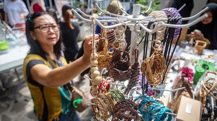 Seorang pengunjung memilih gelang berbahan kertas koran bekas yang dijual dalam kegiatan Pasar Sehati di Urban Farming Corner, Kota Semarang Jawa Tengah, Minggu (1/6/2025). Pasar yang diadakan satu bulan sekali dengan menjual berbagai Ragam produk ramah lingkungan dan makanan-minuman organik itu sebagai wadah puluhan komunitas pelaku usaha yang mengusung prinsip gaya hidup sehat, alami, dan ramah lingkungan serta menjadi salah satu tempat edukasi tentang hidup sehat Demi masyarakat. ANTARA/Aji Styawan/gus