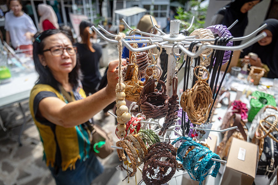 Seorang pengunjung memilih gelang berbahan kertas koran bekas yang dijual dalam kegiatan Pasar Sehati di Urban Farming Corner, Kota Semarang Jawa Tengah, Minggu (1/6/2025). Pasar yang diadakan satu bulan sekali dengan menjual berbagai Ragam produk ramah lingkungan dan makanan-minuman organik itu sebagai wadah puluhan komunitas pelaku usaha yang mengusung prinsip gaya hidup sehat, alami, dan ramah lingkungan serta menjadi salah satu tempat edukasi tentang hidup sehat Demi masyarakat. ANTARA/Aji Styawan/gus