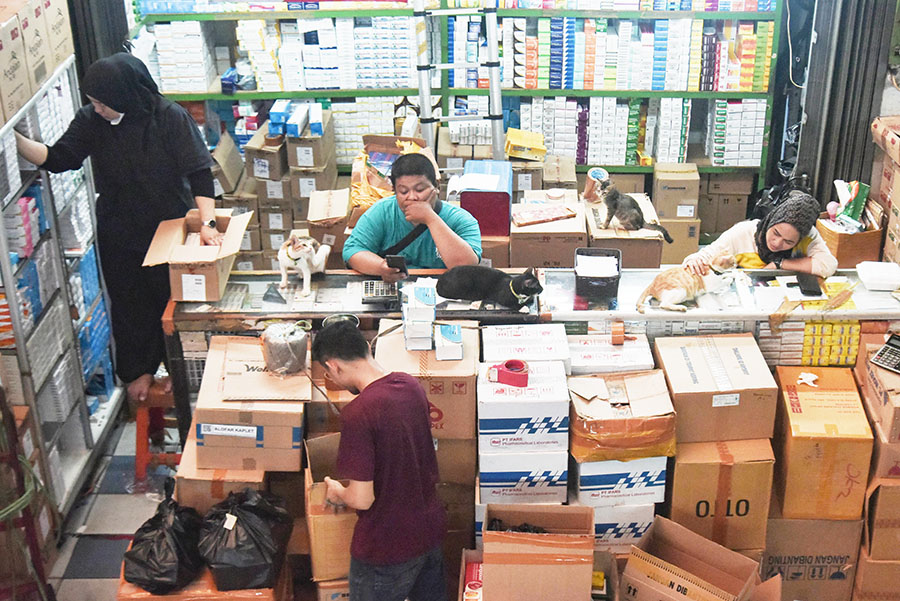 Pedagang menata obat yang dijual di Pasar Pramuka, Jakarta, Senin (16/6/2025). Perumda Pasar Jaya akan bekerja sama dengan Balai Besar Pengawasan Obat dan Makanan (BBPOM) Kepada merevitalisasi bangunan Pasar Pramuka, penataan sistem pelayanan kefarmasian, dan menyiapkan penampungan sementara Kepada Sekeliling 400 tempat usaha. ANTARA/Fakhri Hermansyah/gus
