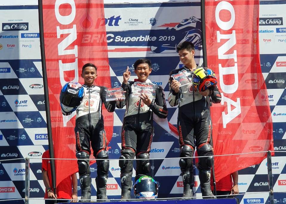 liputanindo.com – Kendali Pebalap binaan PT Astra Honda Motor (AHM) Azryan Dheyo di Thailand Talent Cup (TTC) 2019 Seri 6 Betul-Betul tak terpatahkan setelah menyapu Bersih Race 1 dan race 2 yang digelar Sabtu-Minggu (16-17 November) di podium tertinggi Chang International Circuit, Buriram, Thailand. Dengan hasil ini, semakin terbuka Kesempatan bagi Azryan Dheyo Serempak Herlian Dandi meraih gelar Pemenang Lazim TTC 2019 dan membanggakan nama Bangsa Indonesia.