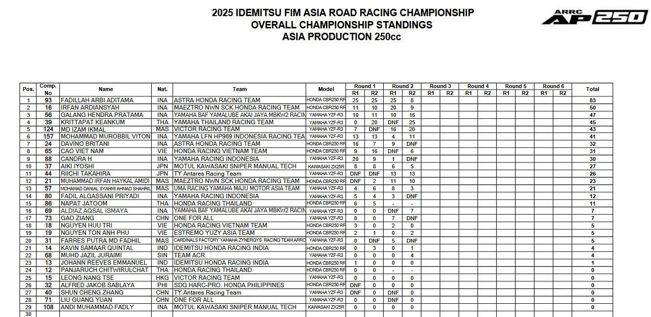 Dengan tambahan delapan poin, Arbi Tetap bertahan di puncak klasemen AP250 dengan 83 poin. Davino menempati posisi ketujuh dengan 32 poin.