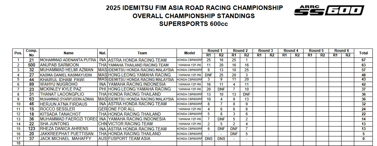 Adenanta Tetap memimpin klasemen SS600 dengan 67 poin, sementara Herjun di posisi ke-10 (32 poin) dan Rheza di posisi ke-15 (13 poin). Di klasemen ASB1000, Andi berada di urutan ke-8 dengan 32 poin.