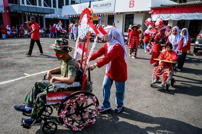 Siswa Yayasan Pembinaan Anak Cacat (YPAC) Jakarta mengikuti pawai kemerdekaan di Jakarta, Senin (19/8/2024) Pawai budaya yang mengangkat tema Nusantara Baru Indonesia Maju tersebut diikuti oleh 82 siswa dan siswi berkebutuhan khusus jenjang TK sampai SMA untuk memperingati HUT ke-79 RI. ANTARA FOTO/Rivan Awal Lingga/sas