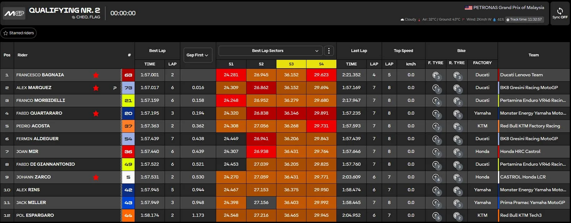 liputanindo.com – Sesi Kualifikasi Ke-dua (Q2) MotoGP sepang 2025 diikuti Oleh 12 Pebalap Acosta, Zarco, Miller, Mir, Quartararo, Digia, Morbidelli, Pol, Alex Marquez, Rins, Aldeguer, dan Bagnaia. Sirkuit Sepang sendiri dalam keadaan Trek Kering. Seluruh Pebalap Menggunakan Ban Soft-Soft. Rekor Laptime 1:56,337 Pecco Bagnaia tahun 2024.