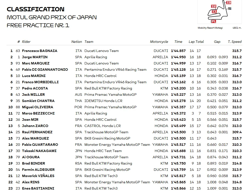 Menit 41 Jorge Martin naik ke posisi 3 dengan ban Medium – Soft lanjut naik ke P2 pada menit ke-43. Dan setelah 45 menit, Pecco Bagnaia menjadi yang tercepat sesi FP1 MotoGP Motegi Jepang 2025. Martin P2, Marc Marquez P3.