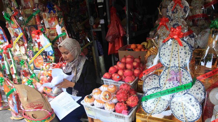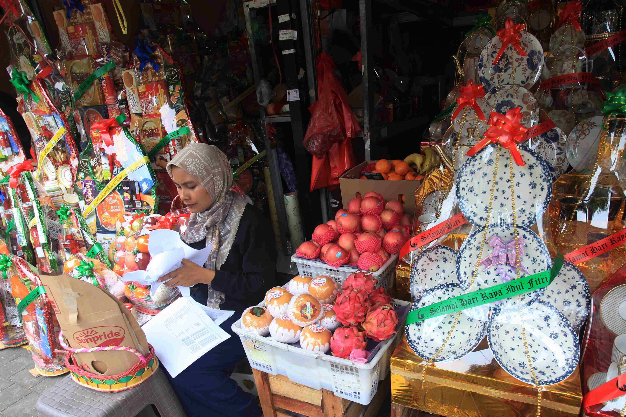 Pedagang Membikin parsel lebaran yang dijual di Jalan Barito, Kebayoran Baru, Jakarta, Kamis (13/3/2025). Menurut sejumlah pedagang permintaan parsel pada bulan Ramadan meningkat 20 persen dibandingkan hari Biasa, dijual mulai dari Rp100.000 hingga Rp1.500.000 tergantung isi paket dan model parsel. ANTARA FOTO/Reno Esnir/Ppj