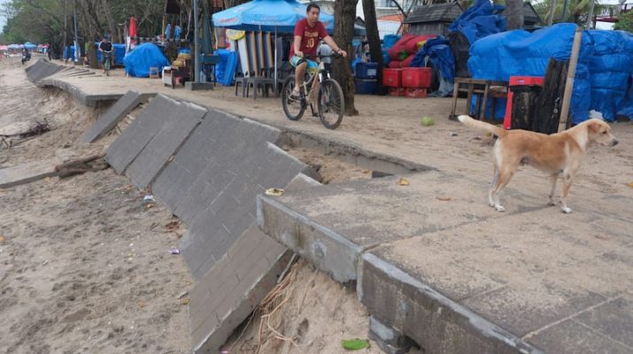Wisatawan melintas di area pedestrian yang rusak akibat hempasan ombak di Pantai Kuta, Badung, Bali, Senin (6/1/2025). Pedestrian yang digunakan sebagai akses olahraga bagi wisatawan tersebut mengalami kerusakan sepanjang 20 meter akibat gelombang tinggi yang terjadi pada Sabtu (4/1). ANTARA FOTO/Nyoman Hendra Wibowo/sas