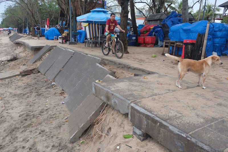 Wisatawan melintas di area pedestrian yang rusak akibat hempasan ombak di Pantai Kuta, Badung, Bali, Senin (6/1/2025). Pedestrian yang digunakan sebagai akses olahraga bagi wisatawan tersebut mengalami kerusakan sepanjang 20 meter akibat gelombang tinggi yang terjadi pada Sabtu (4/1). ANTARA FOTO/Nyoman Hendra Wibowo/sas