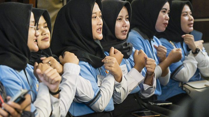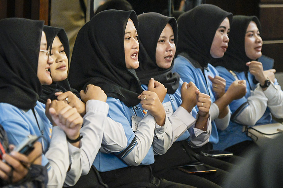 Sejumlah calon pekerja migran mengikuti acara pelepasan pekerja migran Indonesia (PMI) ke luar negeri di Jakarta, Minggu (15/6/2025). Kementerian Perlindungan Pekerja Migran Indonesia (P2MI) berkolaborasi dengan Bilik Dagang dan Industri Indonesia melepas 112 orang perwakilan dari total lima ribu calon PMI ke delapan negara seperti Taiwan, Jepang, Turki, dan Jerman sehingga dapat kembali meningkatkan devisa negara yang Demi ini mencapai Rp253 triliun. ANTRA/Sulthony Hasanuddin/gus