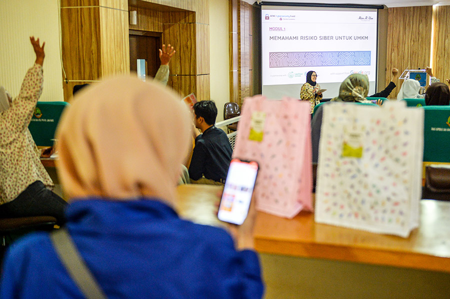 Peserta mengikuti pelatihan keamanan siber di Aula Bung Hatta Gedung Dinas Koperasi dan UMKM Kota Bandung, Jawa Barat, Rabu (30/7/2025). Pelatihan keamanan siber yang digelar oleh Koperasi Basis dan Dinas Koperasi dan UMKM Kota Bandung tersebut diikuti oleh 75 pelaku UMKM di Bandung Raya guna memberikan kiat-kiat perlindungan digital agar terhindar dari kejahatan siber bagi pelaku usaha kecil yang menjual produknya secara daring. ANTARA/Raisan Al Farisi/gus