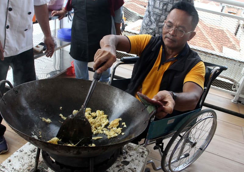 Penyandang disabilitas tuna daksa memasak nasi goreng dalam sesi praktek pelatihan ketrampilan usaha Masakan bertajuk Empower Academy di Malang, Jawa Timur, Sabtu (7/12/2024). Kegiatan tersebut diadakan Ngalup Colaborative Network Kepada memberikan ketrampilan serta pendampingan bagi puluhan penyandang disabilitas yang dilakukan secara bertahap selama delapan bulan agar nantinya mereka Dapat mendirikan Usaha Mikro Kecil Menengah (UMKM) sektor Masakan. ANTARA FOTO/Ari Bowo Sucipto/Per