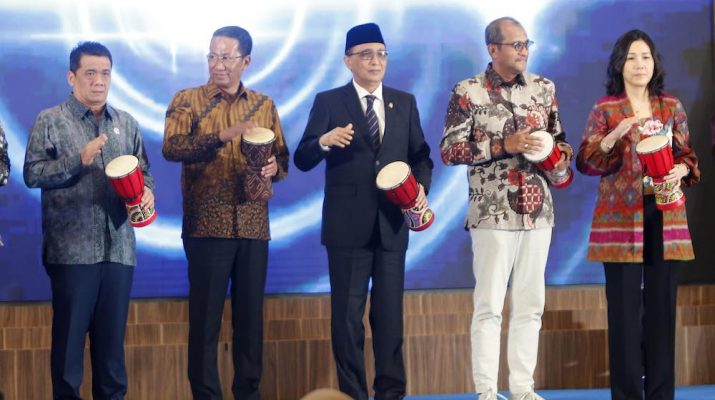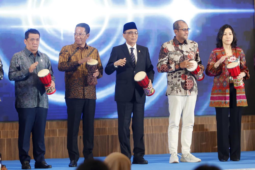 (Dari kiri) Wakil Menteri Desa dan PDT Ahmad Riza Patria, Menteri Hukum Supratman Andi Agtas, Ketua Mahkamah Mulia (MA) Sunarto, Wakil Menteri Hukum Edward Omar Sharif dan Wakil Menteri Pemberdayaan dan Perlindungan AnakĀ (PPA) Veronica Tan memukul tifa Demi peluncuran pos Sokongan hukum (Posbankum) Desa/Kelurahan di Gedung Pengayoman, Kementerian Hukum dan HAM, Rasuna Said, Jakarta, Kamis (5/6/2025). Kerja sama lintas sektor antara Kementerian Hukum, Mahkamah Mulia, Kementerian Desa dan PDT, Kementerian Dalam Negeri serta Kementerian PPA tersebut menjadi langkah konkret dalam memperluas akses keadilan bagi masyarakat melalui kehadiran Posbankum di desa dan kelurahan serta pemanfaatan portal informasi Sokongan hukum yang terintegrasi secara digital. MI/Susanto/sas
