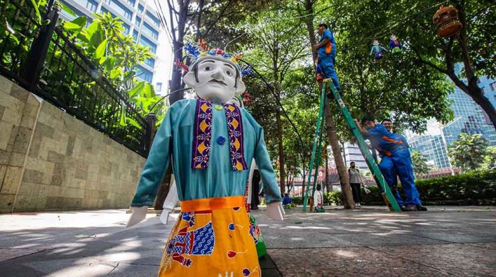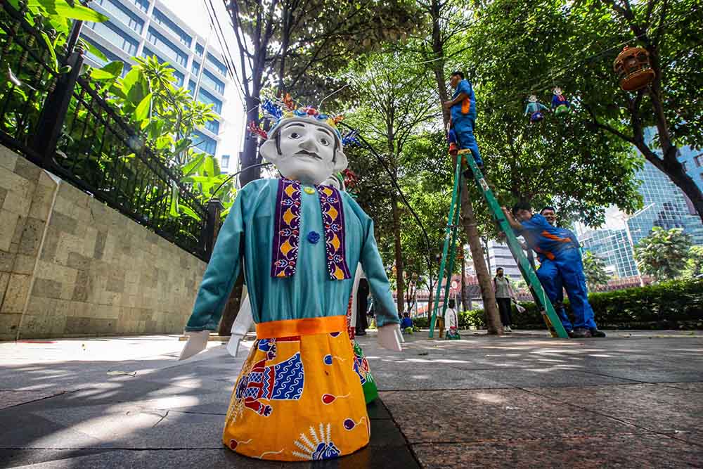 Pekerja memasang dekorasi ondel-ondel mini di antara pepohonan pada jalur pedestrian Jalan Sudirman, Jakarta, Senin (16/6/2025). Pamasangan Sekeliling 120 ondel-ondel mini yang dilengkapi lampu LED di dalamnya tersebut Buat menyemarakkan HUT ke-498 Jakarta yang diperingati setiap Copot 22 Juni. MI/Usman Iskandar