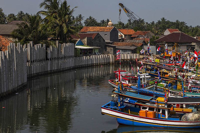 Sejumlah kapal bersandar di dekat pembangunan dinding turap di Sungai Cipunten Akbar, Kabupaten Pandeglang, Banten, Senin (19/8/2024). Dinas Pekerjaan Lumrah dan Penataan Ruang (DPUPR) Provinsi Banten memasang dinding penahan (turap) sepanjang 243 meter di sisi Sungai Cipunten Akbar dengan anggaran APBD Mengertin 2024 sebesar Rp5,5 miliar yang bertujuan untuk meminimalkan potensi banjir akibat luapan air dari sungai. ANTARA/Angga Budhiyanto/gus