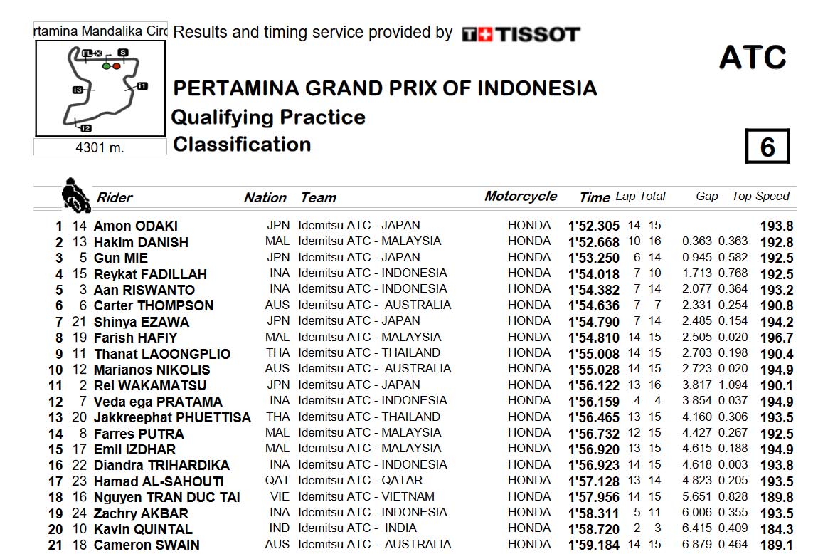 Pimpinan Pengelompokkan Sementara Pasca Seri Qatar, Amon Odaki dari Jepang berhasil Menjadi yang tercepat di sesi Kualfikasi dan Meraih Pol Possition dengan Laptime 1:55,305. FYI Laptime tercepat 2022 Mandalika ATC adalah 1:44,467 dalam keadaan kering Oleh Gun Mie.