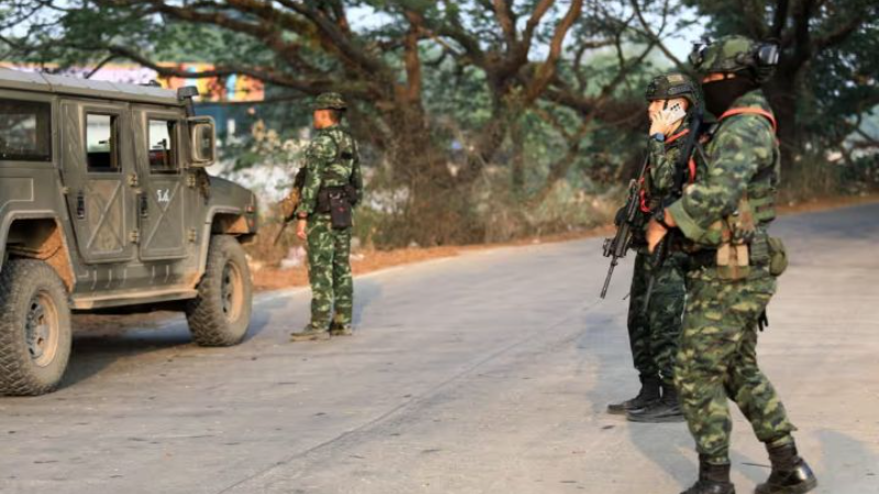 Prajurit Myanmar berpatroli di area perbatasan. (EPA)