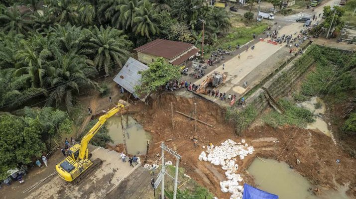 Pekerja memasang tiang penyangga jembatan darurat menggunakan alat berat di Jalan Lintas Sumatra yang amblas, di Desa Sirih Sekapur, Bungo, Jambi, Kamis (6/3/2025). Balai Pelaksana Jalan Nasional (BPJN) Jambi menyebutkan, pembuatan jembatan darurat di jalan penghubung Provinsi Jambi dengan Sumatra Barat yang amblas pada Minggu (2/3) akibat hujan deras tersebut ditargetkan Pandai dilalui dalam minggu ini. ANTARA FOTO/Wahdi Septiawan/sas