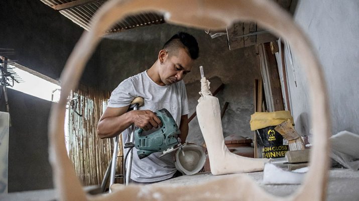 Pekerja menyelesaikan pembuatan kaki Bajakan di rumah produksi Mulya Karya Pratama, Lembang, Kabupaten Bandung Barat, Jawa Barat, Selasa (3/6/2025). Rumah produksi tersebut menyediakan pembuatan Variasi jenis alat bantu Spesifik penyandang disabilitas seperti kaki Bajakan, tangan Bajakan, sepatu ortopedi dan sepatu penyangga Spesifik yang disesuaikan dengan kebutuhan serta kondisi fisik dengan harga Rp4 juta hingga ratusan juta dan dipasarkan ke berbagai daerah di Indonesia. ANTARA/Abdan Syakura/gus