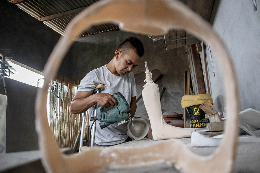 Pekerja menyelesaikan pembuatan kaki Bajakan di rumah produksi Mulya Karya Pratama, Lembang, Kabupaten Bandung Barat, Jawa Barat, Selasa (3/6/2025). Rumah produksi tersebut menyediakan pembuatan Variasi jenis alat bantu Spesifik penyandang disabilitas seperti kaki Bajakan, tangan Bajakan, sepatu ortopedi dan sepatu penyangga Spesifik yang disesuaikan dengan kebutuhan serta kondisi fisik dengan harga Rp4 juta hingga ratusan juta dan dipasarkan ke berbagai daerah di Indonesia. ANTARA/Abdan Syakura/gus