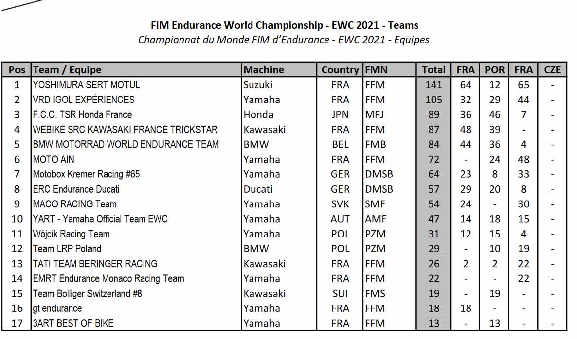 Menyaksikan data poin sementara di atas, praktis dengan seri Most yang hanya menyiapkan total 50 poin maka Pemenang dunia balap ketahanan 2021 hanya akan berasal dari dua tim: SERT Suzuki atau VRD Igol karena jarak keduanya berselang 36 poin. Walaupun tentu never say never, dengan Waktu Senggang Nomor yang segini besar dan Menyaksikan konduite, performa dan kualitas dari SERT Suzuki yang diperkuat Gregg Black, mantan pembalap MotoGP Xavier Simeone dan test rider Suzuki MotoGP Sylvain Guintoli.