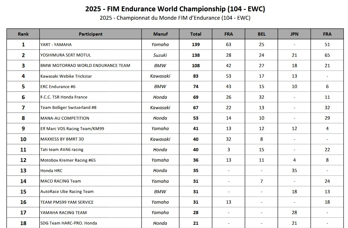Setelah tak pernah unggul sejak jam ke-tujuh, Yoshimura SERT Motul berhasil meraih tiga kemenangan di Bol d’Or, tetapi kehilangan gelar EWC dari Yamalube YART Yamaha EWC Official Team dengan selisih satu poin dalam akhir yang dramatis Demi perebutan gelar Pemenang Dunia tahun 2025.