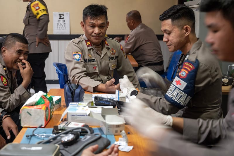 Member kepolisian pengamanan TPS mengikuti pemeriksaan kesehatan di Biddokes Mapolresta Palu, Sulawesi Tengah, Minggu (24/11/2024). Polresta Palu mewajibkan 690 personelnya Kepada memeriksakan kesehatan sebelum diterjunkan dalam pengamanan di 507 TPS pada Pilkada Serentak 27 November mendatang. ANTARA FOTO/Basri Marzuki/sas