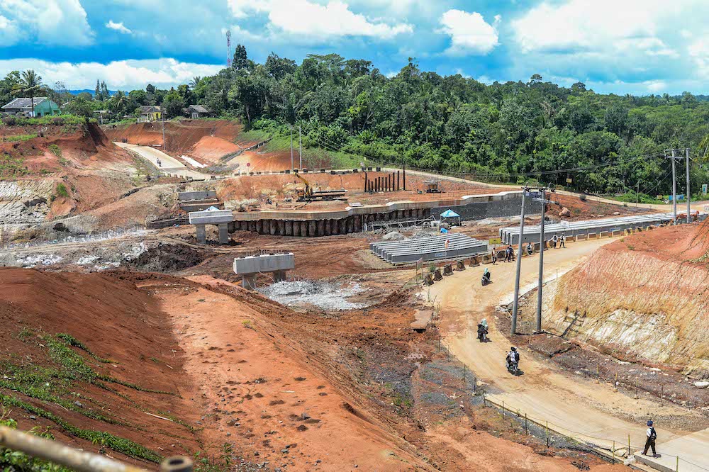 Pekerja menggunakan alat berat menyelesaikan pembangunan jalan tol Serang-Panimbang di Bojong, Pandeglang, Banten, Jumat (14/3/2025). Pemerintah akan melanjutkan proyek strategis nasional (PSN) pembangunan jalan tol Serang-Panimbang sepanjang 83,67 kilometer yang ditargetkan akan rampung pada akhir tahun 2026. ANTARA FOTO/Muhammad Bagus Khoirunas/sas