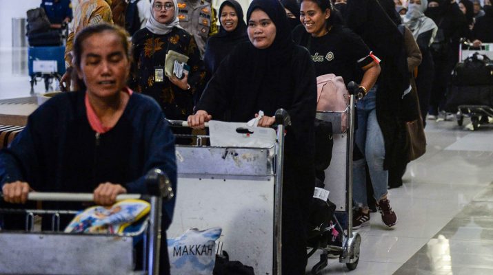 Menteri Perlindungan Pekerja Migran Indonesia (P2MI) Abdul Kadir Karding (kanan) berbincang dengan Pekerja Migran Indonesia (PMI) di Terminal 3 Bandara Global Soekarno-Hatta, Kota Tangerang, Banten, Sabtu (15/3/2025). Pemerintah memulangkan sebanyak 193 PMI yang telah dideportasi dari Arab Saudi karena melanggar aturan keimigrasian dan selanjutnya akan dikembalikan ke daerah asal masing-masing. ANTARA FOTO/Putra M. Akbar/Ppj