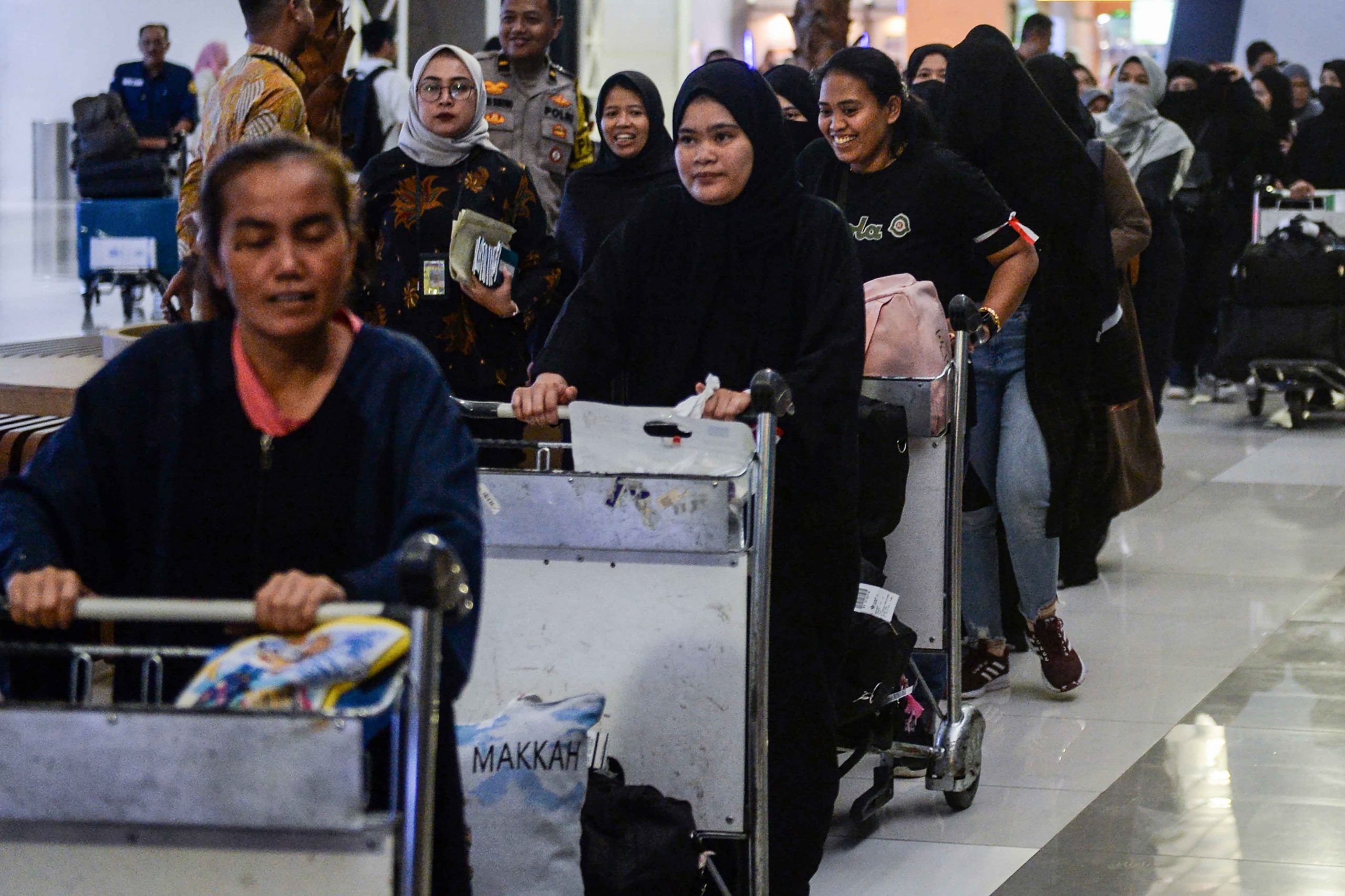 Menteri Perlindungan Pekerja Migran Indonesia (P2MI) Abdul Kadir Karding (kanan) berbincang dengan Pekerja Migran Indonesia (PMI) di Terminal 3 Bandara Global Soekarno-Hatta, Kota Tangerang, Banten, Sabtu (15/3/2025). Pemerintah memulangkan sebanyak 193 PMI yang telah dideportasi dari Arab Saudi karena melanggar aturan keimigrasian dan selanjutnya akan dikembalikan ke daerah asal masing-masing. ANTARA FOTO/Putra M. Akbar/Ppj