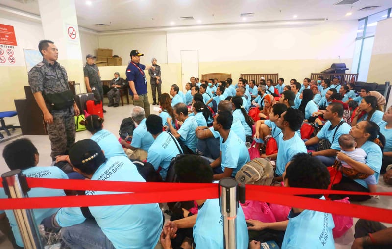 Sejumlah Anggota Negara Indonesia (WNI) menjalani deportasi di Pelabutan Stulang Laut Malaysia, Johor Bahru, Kamis (14/11/2024). Konsulat Jenderal Republik Indonesia Johor Bahru memfasilitasi pemulangan 105 WNI yang dideportasi dari Malaysia lewat jalur laut ke Tanjung Pinang, Kepulauan Riau. ANTARA FOTO/Virna Puspa Setyorini/Per