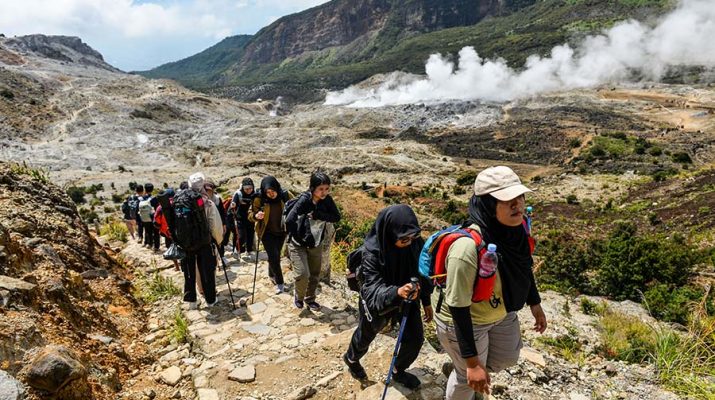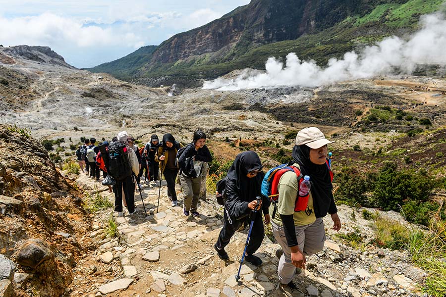 Pendaki menaiki bukit di samping Kawasan di Taman Wisata Alam (TWA) Gunung Papandayan di Kabupaten Garut, Jawa Barat, Senin (12/5/2025). Pengelola TWA Gunung Papandayan memprediksi pada libur panjang waisak 2025 pengunjung yang berlibur di Gunung Papandayan mengalami kenaikan hingga 15% dibanding hari Lumrah atau mencapai 2000 pengunjung perhari sejak Sabtu (10/5)-Senin (12/5). ANTARA/Raisan Al Farisi/gus