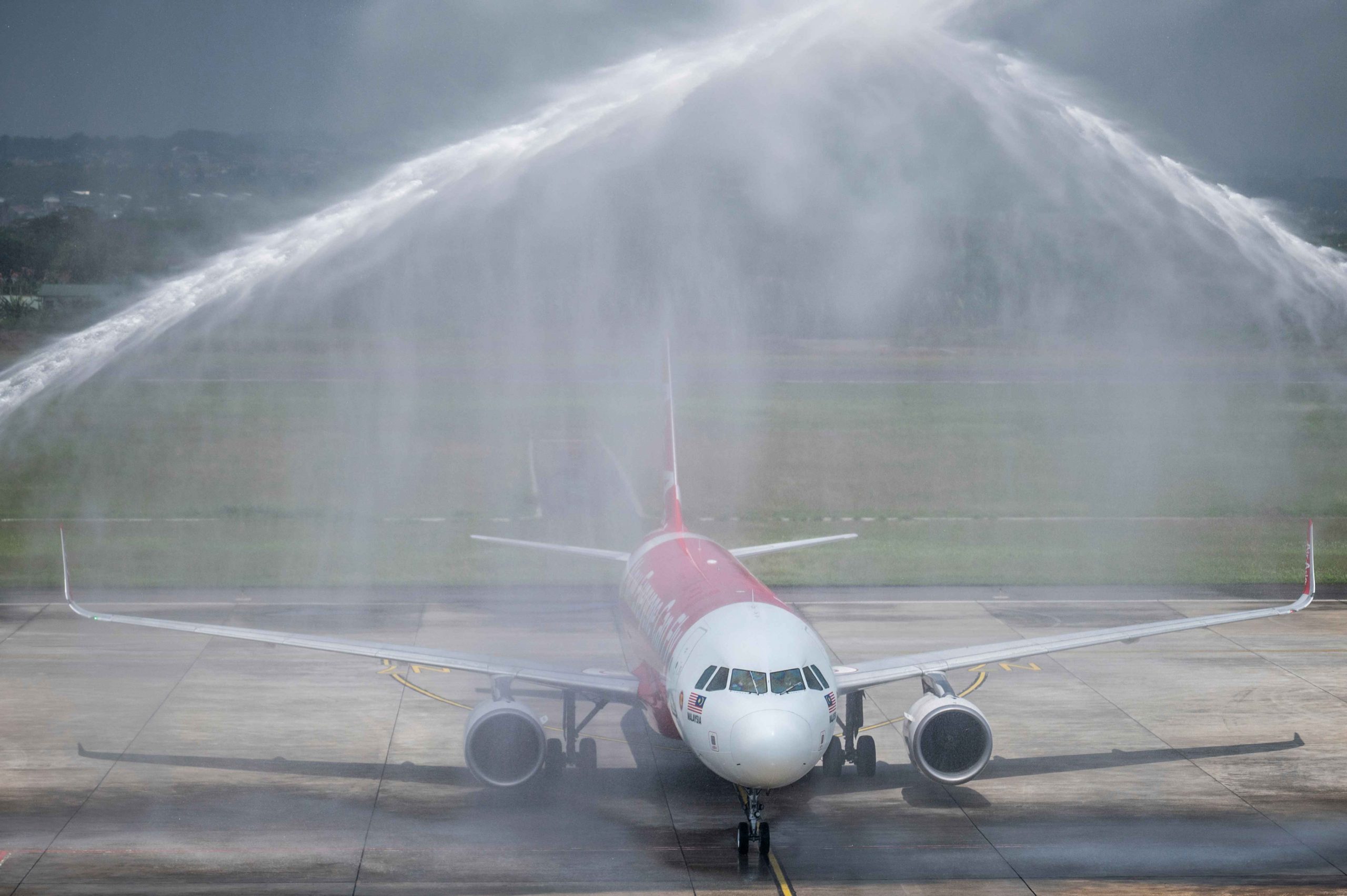 Pesawat jenis Airbus A320 dari maskapai penerbangan AirAsia mendapat penyambutan water salute Begitu penerbangan perdana rute Dunia di Bandara Jenderal Ahmad Yani, Semarang, Jawa Tengah, Jumat (5/9/2025). Bandara Dunia Jenderal Ahmad Yani Semarang Formal membuka kembali penerbangan rute Dunia Semarang – Kuala Lumpur melalui maskapai AirAsia yang beroperasi dengan frekuensi penerbangan tujuh kali dalam seminggu menggunakan pesawat jenis Airbus A320. ANTARA FOTO/Aprillio Akba
