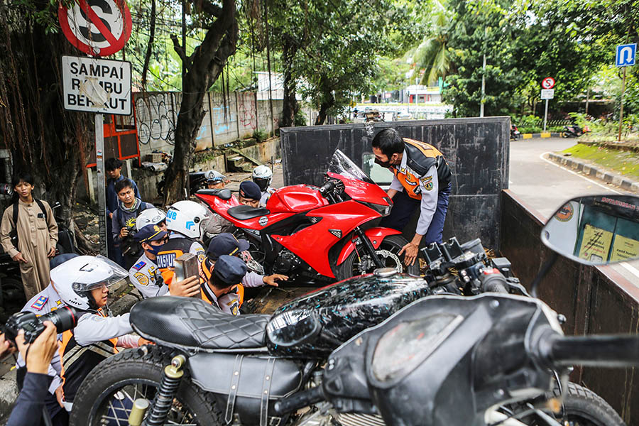 Petugas Sudin Perhubungan Jakarta Selatan mengangkut sepeda motor yang parkir di bahu jalan ke atas truk di kawasan Gandaria City, Jakarta, Selasa (18/3/2025). Dalam rangka Operasi Lintas Jaya Spesies Dinas Perhubungan Kota Administrasi Jakarta Selatan menertibkan 12 kendaraan bermotor roda dua yang parkir liar di bahu jalan sebagai upaya menciptakan kenyamanan dan kelancaran Lampau lintas. ANTARA/Asprilla Dwi Adha/gus