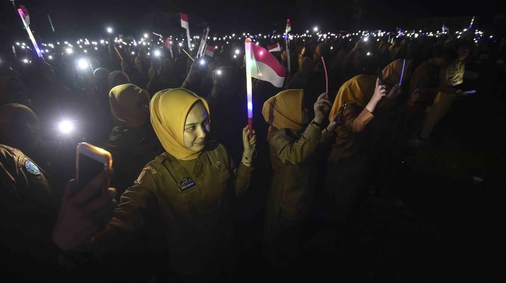 Pegawai Pemerintah dengan Perjanjian Kerja Sama (PPPK) menyalakan lampu usai seremonial pelantikan dan pengambilan sumpah/janji pengangkatan PPPK di Alun-Alun Batang Hari, Jambi, Jumat (22/8/2025). Pemerintah Kabupaten Batang Hari melantik sebanyak 1.742 orang PPPK Tahap II Tahun Anggaran 2024 dengan rincian Pola tenaga teknis sebanyak 1.469 orang dan tenaga kesehatan 273 orang. ANTARA/Wahdi Septiawan/bar/rdi