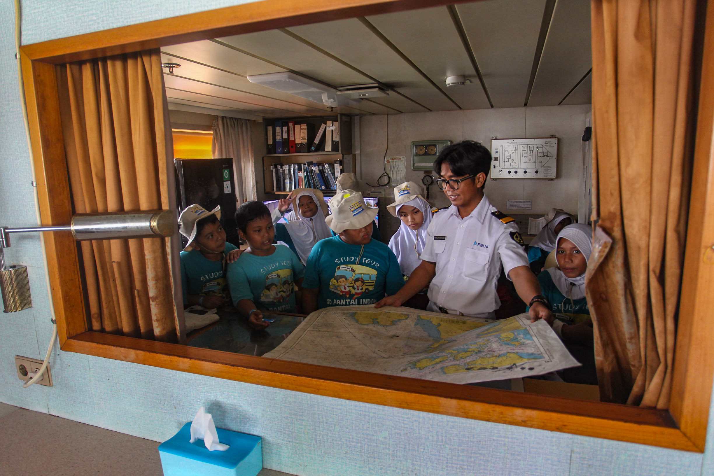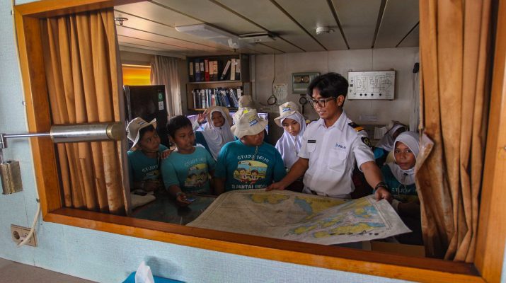 Para siswa SDS Pantai Indah Cilincing mengikuti tour on bord atau menjelajahi kapal penumpang KM Kelud yang tengah bersandar di Pelabuhan Tanjung Priok, Jakarta, Jumat (20/6/2025). Kegiatan tour on board ini menjadi upaya Pelni memperkenalkan wawasan kemaritimin nusantara kepada anak-anak sejak Awal. MI/Usman Iskandar/Ppj