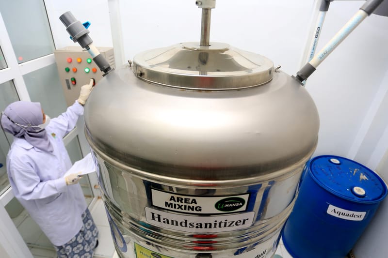 PEMBUATAN CAIRAN ANTISEPTIK PEMBERSIH TANGAN: Mahasiswi menyelesaikan proses pembuatan cairan antiseptik pembersih tangan atau “hand sanitizer” di Pusat Unggulan Iptek Birum Aceh Atsiri Research Center (ARC) Universitas Syiah Kuala, Banda Aceh, Aceh, Jumat(ANTARA/Syifa Yulinnas)