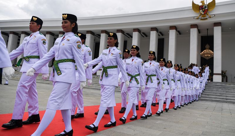 Member Paskibraka 2024 berbaris seusai dikukuhkan oleh Presiden Joko Widodo di Istana Negara, Ibu Kota Nusantara (IKN), Kalimantan Timur(ANTARA FOTO/Sigid Kurniawan)