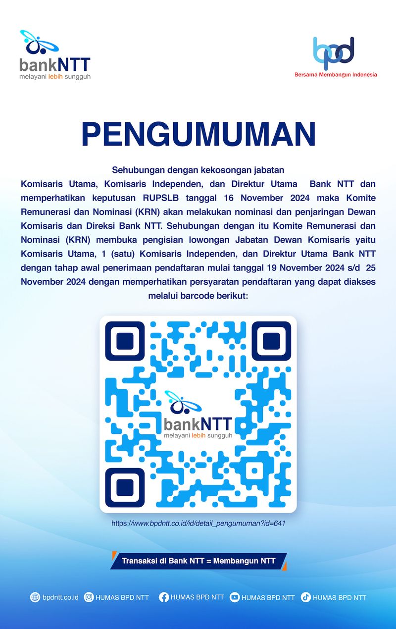 Pengumuman Lowongan Jabatan Dewan Komisaris Bank NTT Diperpanjang