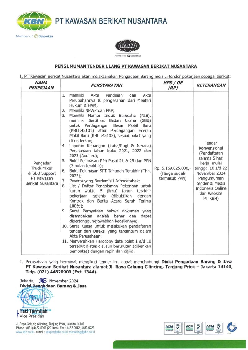 PT Kawasan Berikat Nusantara mengadakan Pengadaan Truck Mixer di SBU Support PT Kawasan Berikat Nusantara. Tender konvensional (pendaftaran selama 5 Hari kerja, mulai Copot 18 November s/d 22 November 2024) Tender di Media Indonesia Online dan Website PT KBN) ini dengan ketentuan persyaratan sebagai berikut: