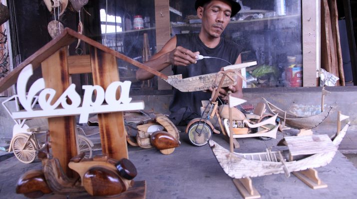 Perajin menyelesaikan pembuatan miniatur Vespa dari limbah kayu di Art Roma Galeri, Medan, Sumatra Utara, Jumat (12/9/2025). Otoritas Jasa Keuangan (OJK) mencatat penyaluran kredit perbankan kepada UMKM per Juli 2025 mencapai Rp1.496,93 triliun atau setara 18,16 persen dari total kredit, serta tumbuh 1,82 persen secara tahunan (year on year/yoy).