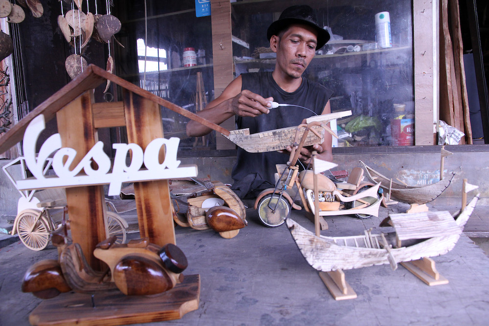 Perajin menyelesaikan pembuatan miniatur Vespa dari limbah kayu di Art Roma Galeri, Medan, Sumatra Utara, Jumat (12/9/2025). Otoritas Jasa Keuangan (OJK) mencatat penyaluran kredit perbankan kepada UMKM per Juli 2025 mencapai Rp1.496,93 triliun atau setara 18,16 persen dari total kredit, serta tumbuh 1,82 persen secara tahunan (year on year/yoy).
