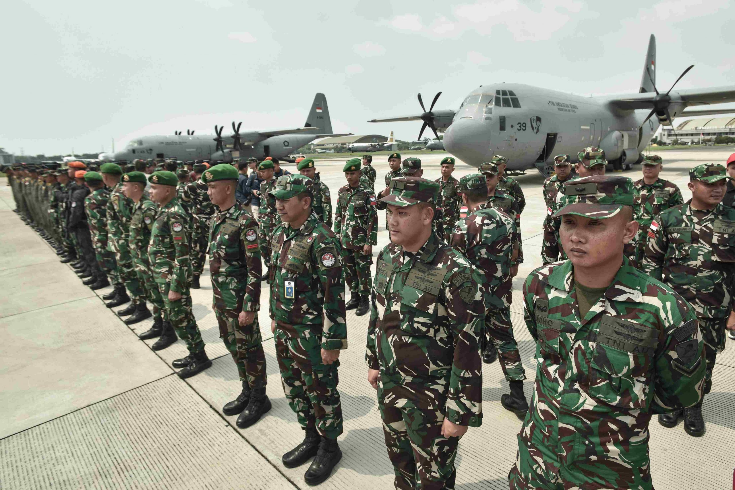 Kepala Staf TNI Angkatan Udara (KSAU) Marsekal TNI Mohamad Tonny Harjono (kiri) menyalami Prajurit TNI yang tergabung dalam Satgas Garuda Merah Putih II usai melaksanakan misi kemanusiaan ke Gaza di Lanud Halim Perdanakusuma, Jakarta Timur, Sabtu (13/9/2025). Satgas Garuda Merah Putih II berhasil menyalurkan Donasi ke Gaza sebanyak 91,4 ton menggunakan tiga pesawat Super Hercules yang terdiri dari bahan makanan, obat-obatan, dan logistik lewat skema airdrop Serempak 15 negara yang tergabung dalam solidarity operation. ANTARA FOTO/Fakhri Hermansyah/Ppj